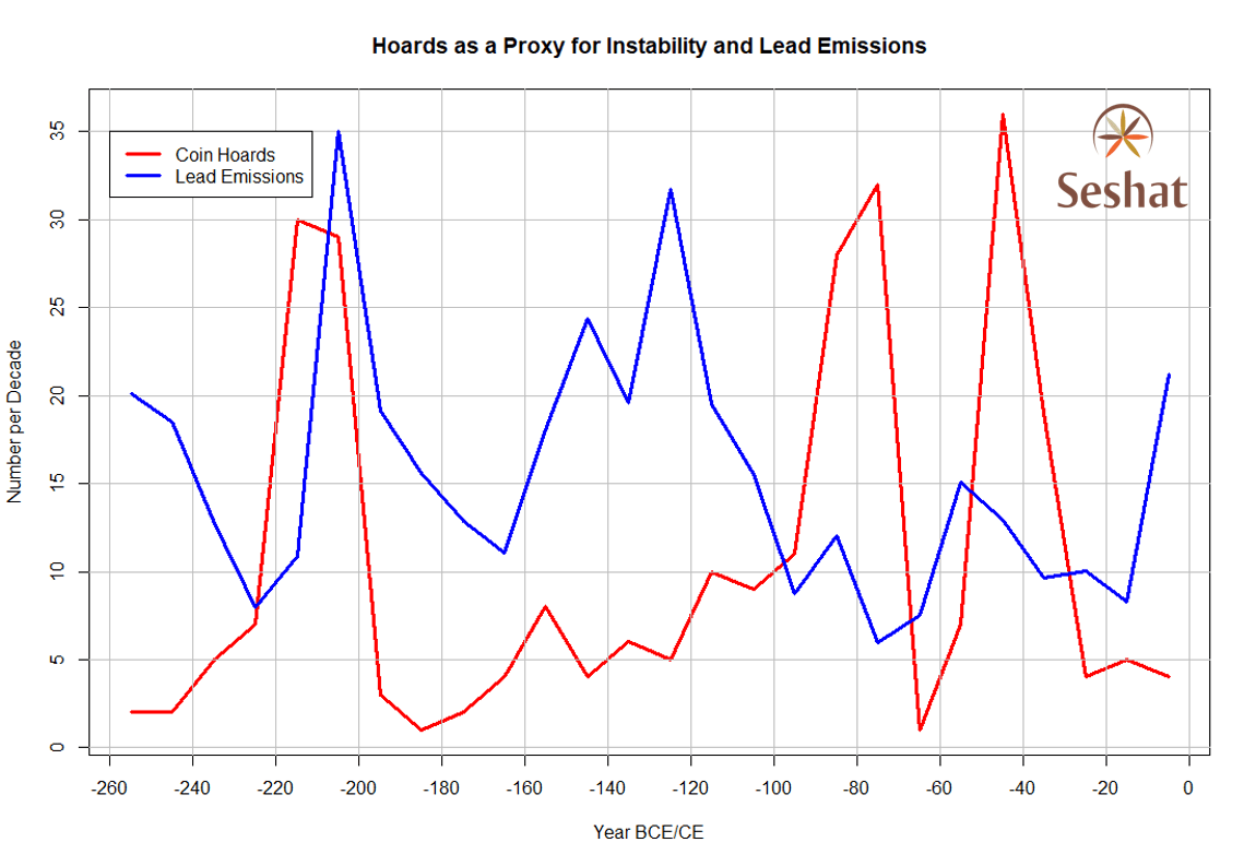 The three periods of intense warfare that are prominent in this figure are the Second Punic War and the two rounds of civil wars during the crisis of the Roman Republic (for details, see Chapter 6 of Secular Cycles). So, what happens when we compare the hoard index of war intensity with the lead emissions index? Here’s what: