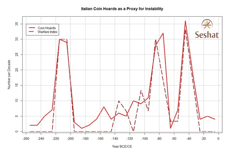 Some years ago Walter Scheidel and I published an article (also in PNAS) which capitalized on this relationship to resolve a long-standing debate in Roman demography. Here I plot the data from that article on coin hoard frequency and and index of war intensity in Italy, derived from textual sources: