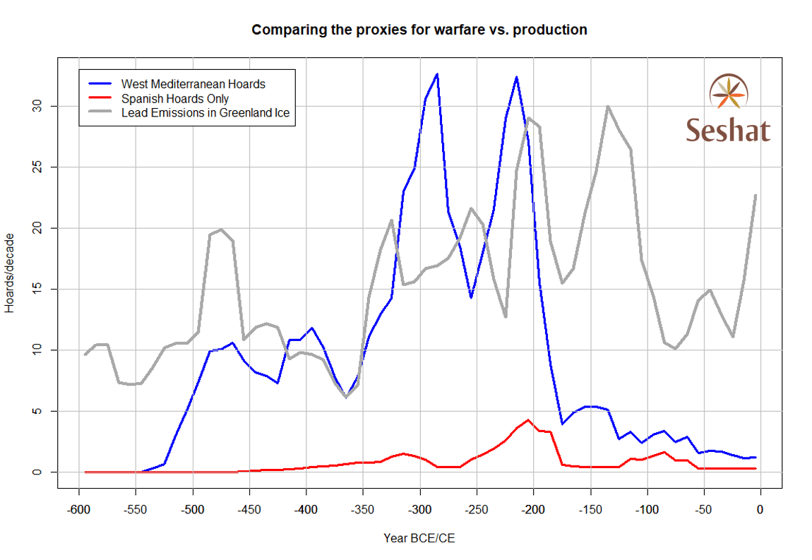 I think that it would need to be several sub-regional proxies extending the Italian measure – either dummy or a rating. For instance, Livy XXIV, 40 tells us of fighting in Greece, XXIV, 41-43 has fighting in Spain of 214-213 BCE which merit a rating of 1 for both as dummies or 1 and (by the sound of it, at least 3 on a rating of 1 to 5) Then Spain was quiet for a couple of years (0 or 1) and a big battle (4) followed. Nothing mentioned in Greece. That approach would allow a more complex analysis, possibly also taking note that the mining area changes over time (by the first century CE, southern Britain was contributing to the Pb emissions). The upsurge in Spanish coin hoards in the 90s BCE is, I take it, linked to Sertorius’s war in Spain and the lead emissions go down (mostly).
