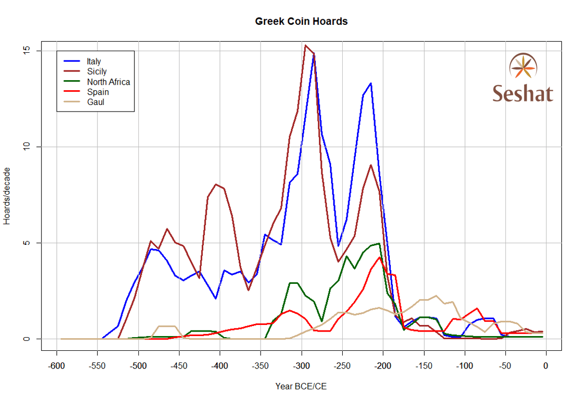 These curves decline shortly after 200 BCE, because the Roman denarius becomes the main means of exchange in the Western Mediterranean (note that Italian Hoards above are largely based on the silver denarius, with a few bronze coin hoards early in the sequence).